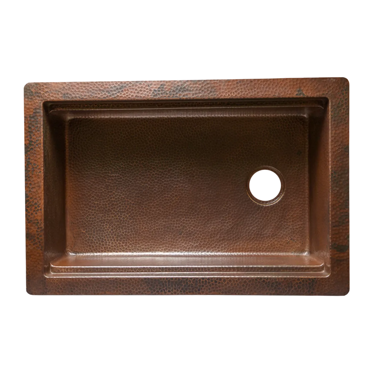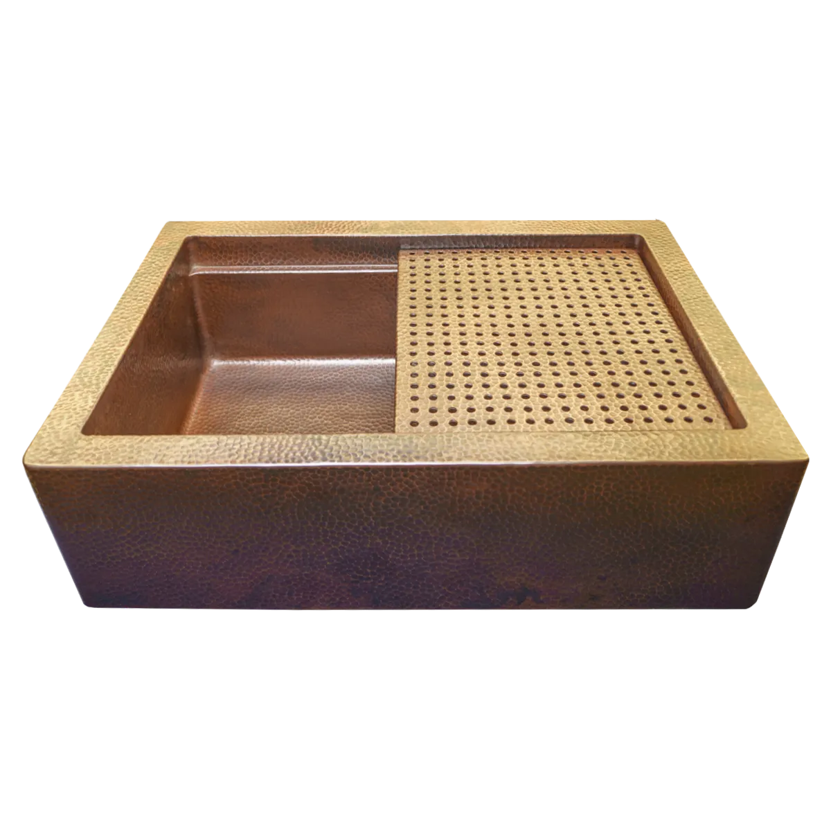 Farmhouse Kitchen Sink with the “Aged Brushed Copper” patina and a 3.5” drain hole. Equipped with the sink drying rack (Accessories sold separately)