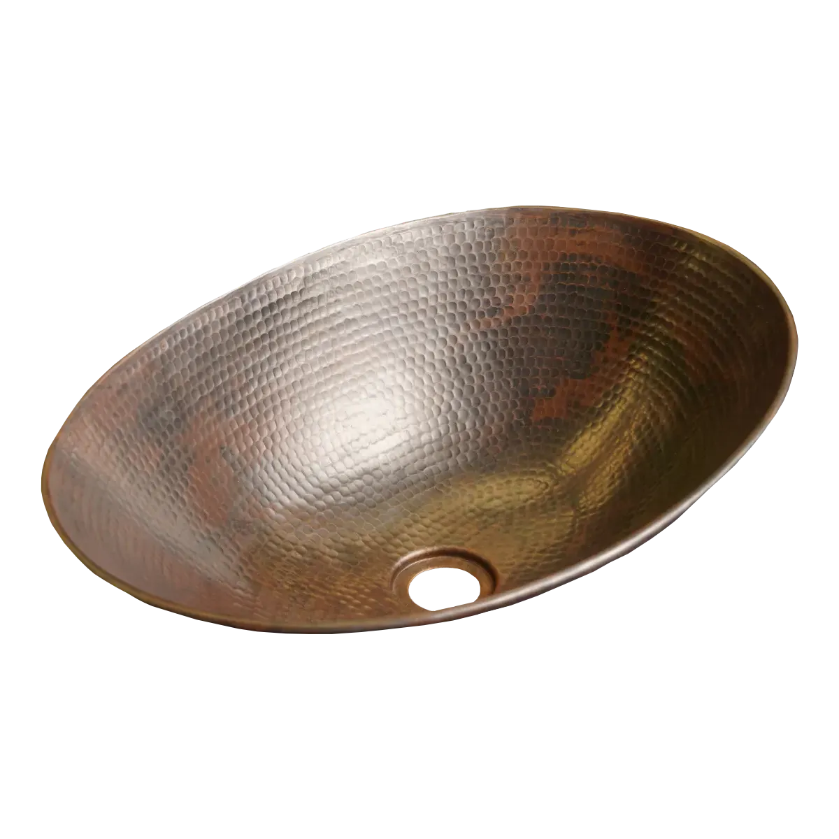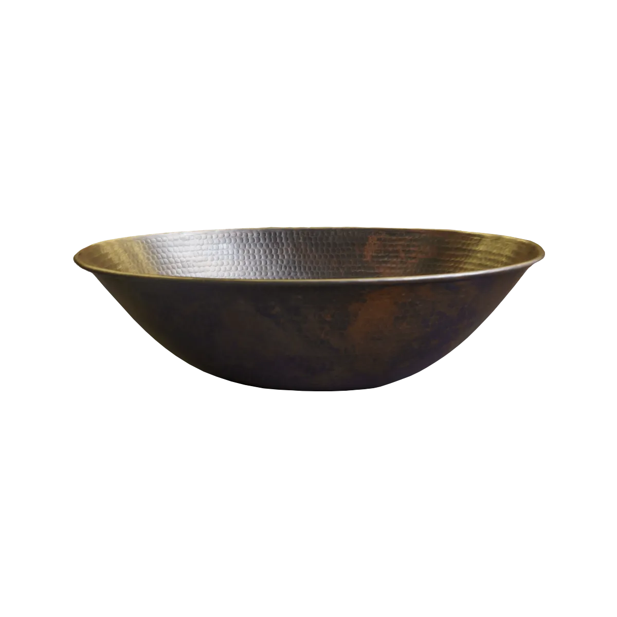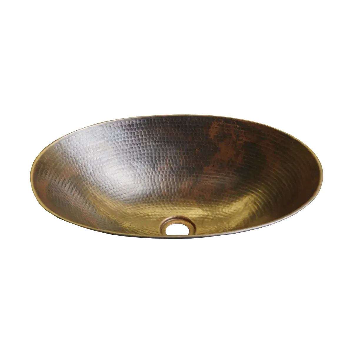 The oval vessel sink is adorned with our elegant “aged copper” patina, accentuated by meticulous in-line hammering and equipped with a 1.5” drain hole.
