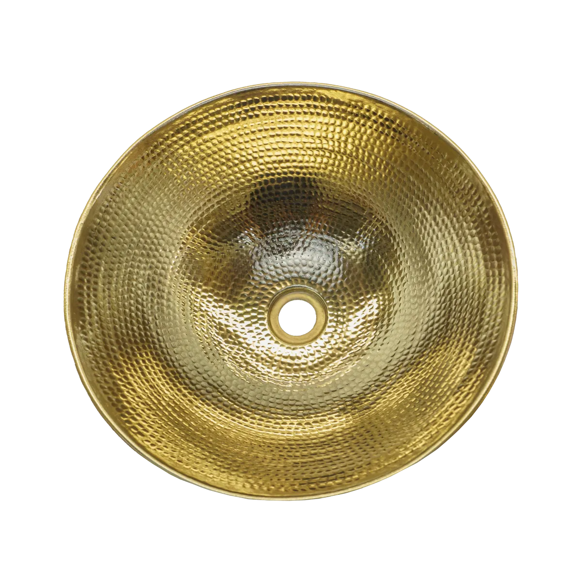 Round brass vessel sink, with an in-line hammering, “shiny brass” and a 1.5” drain hole