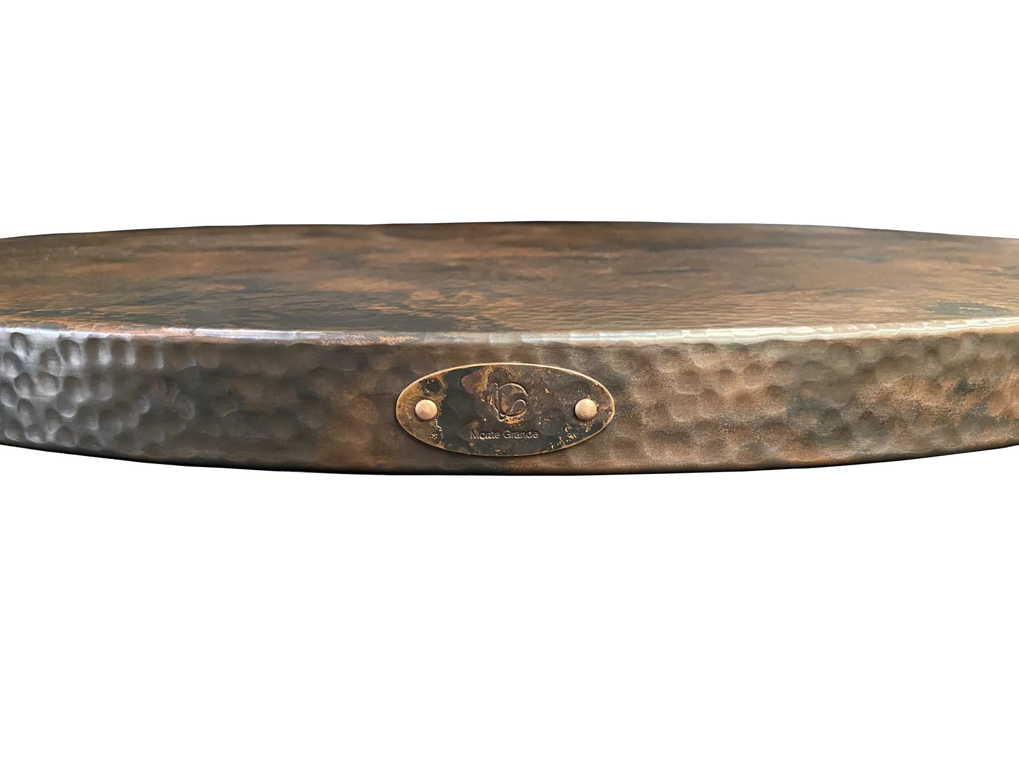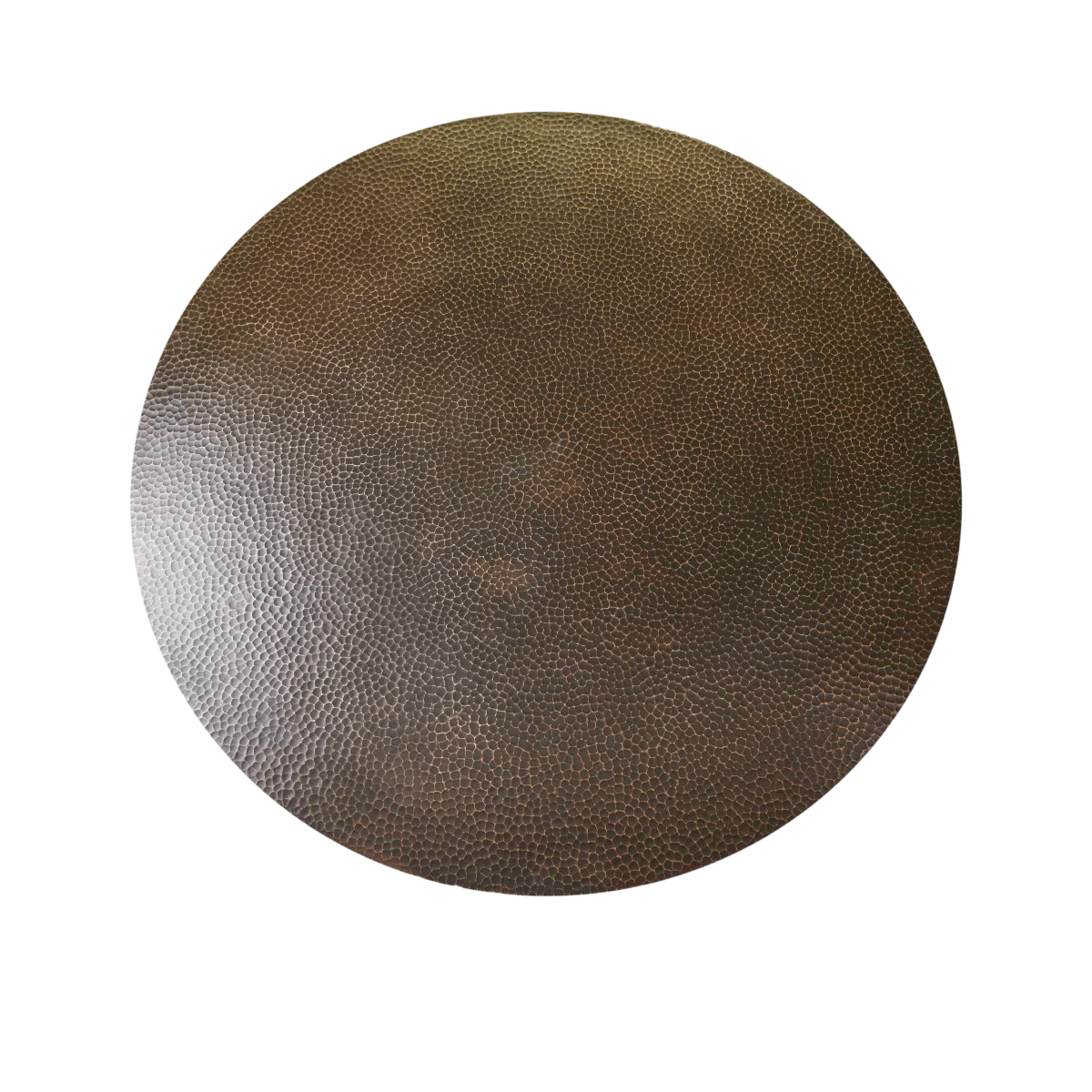 Round hammered copper tabletop with rich fired patina. Artisan-crafted in Mexico.