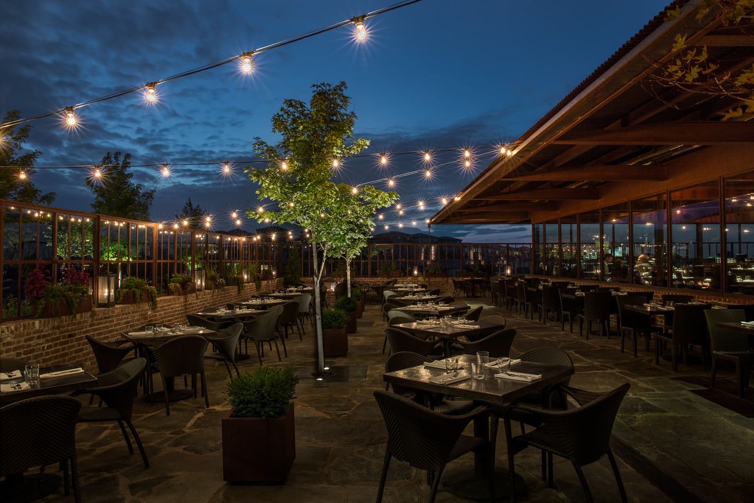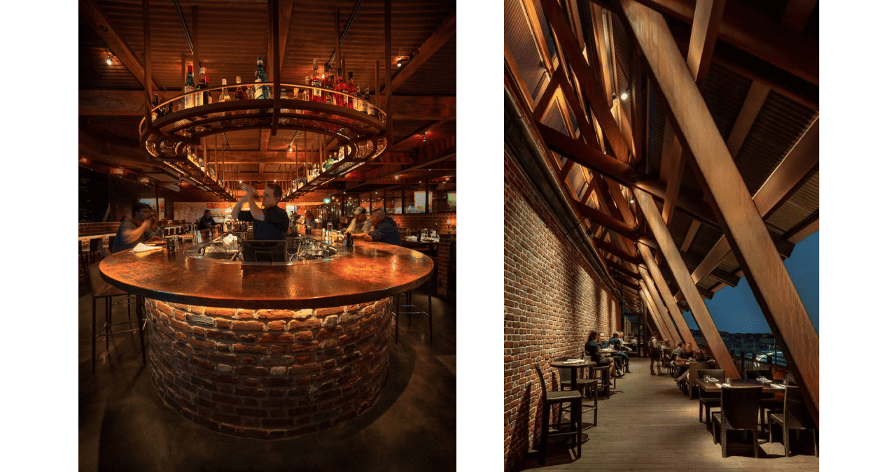 Sierra Restaurant is defined as much by its architecture as by its interiors. The building sits elevated, opening outward to the landscape, with long structural lines, exposed framing, and a strong horizontal presence that gives the space a clear identity from the outside in.