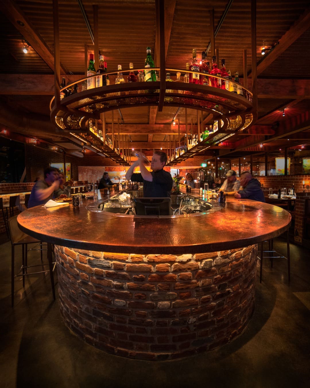 Copper is introduced across the bar, tabletop surfaces, and wall cladding, adding warmth and continuity throughout the space. It doesn’t compete with the architecture — it works with it. The finishes pick up the ambient light and shift subtly depending on where you stand, bringing depth without adding noise.