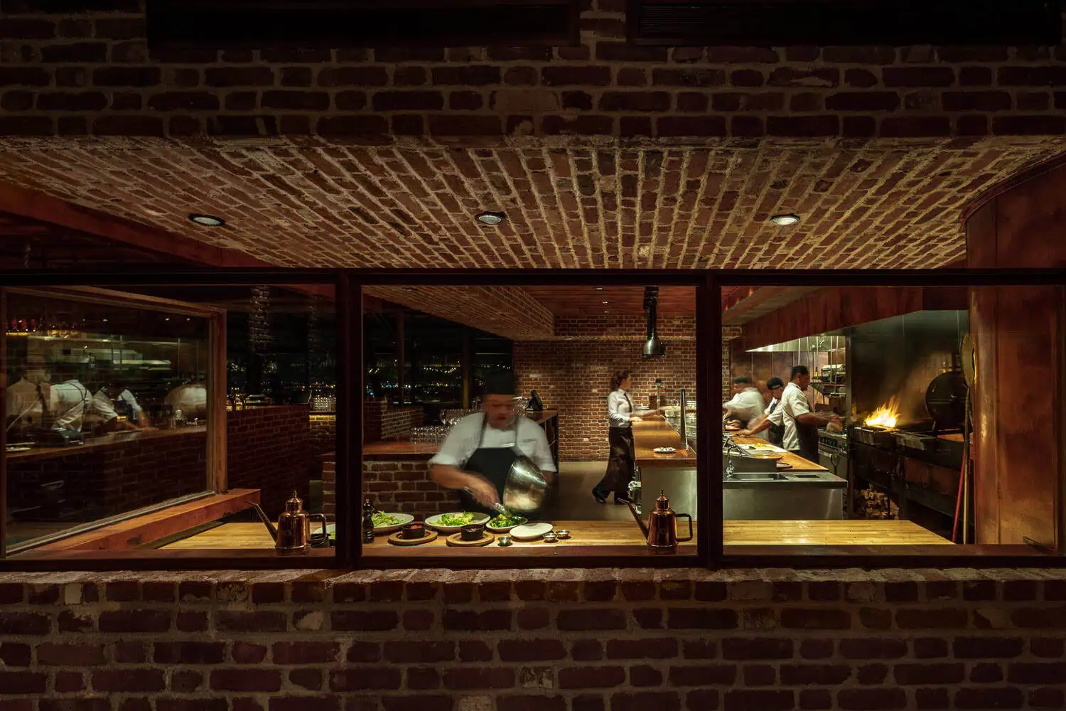 Inside, that structure carries through. The scale is generous, but still controlled — nothing feels overwhelming. Wood, brick, and steel set the base, creating a grounded, architectural backdrop that feels solid and intentional.